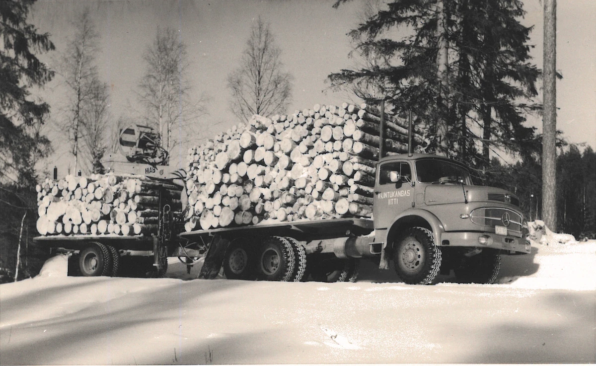 "Toinen mies nosti pölkyn kuormaa vasten pystyyn ja toinen veti sen ylös kuormaan."