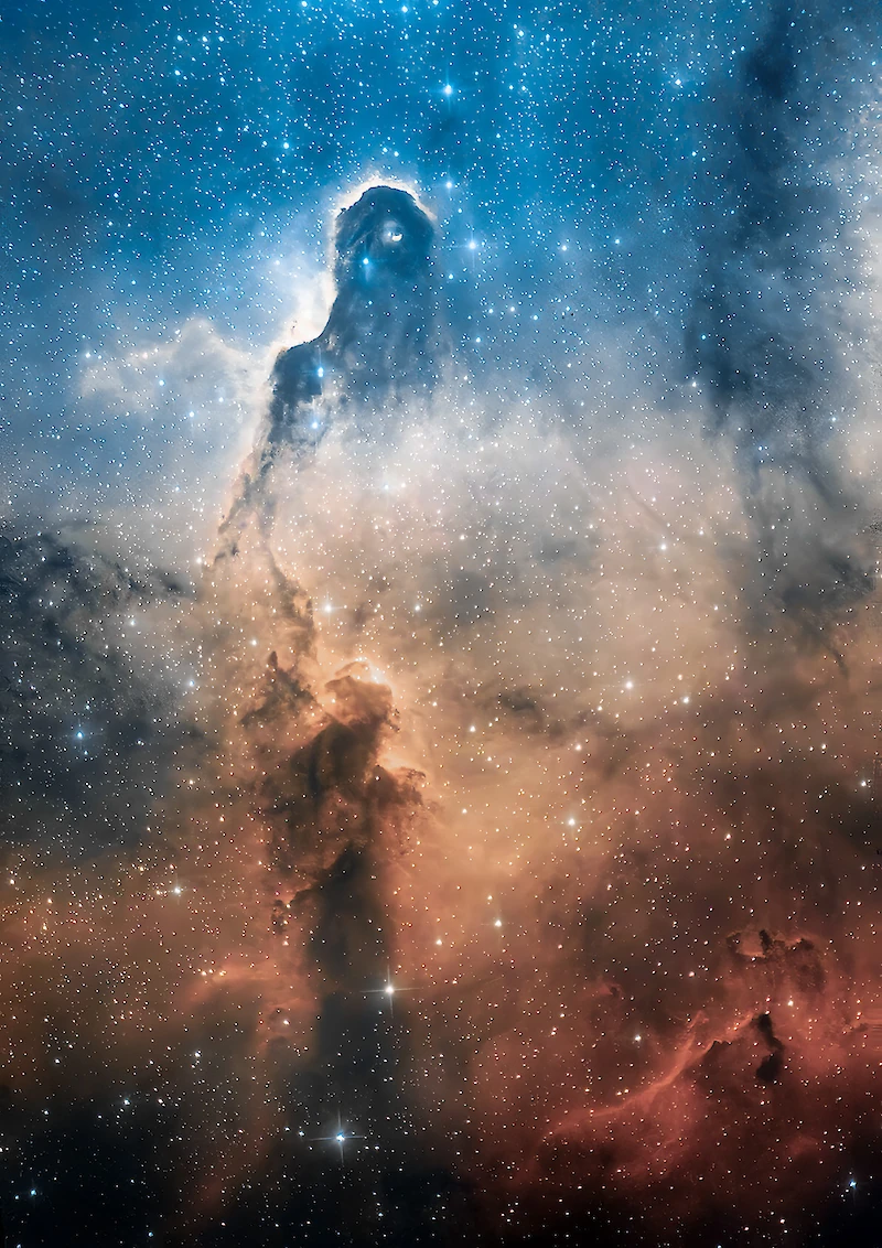 IC1396 sijaitseen Kefeuksen tähdistössä noin 2 400 valovuoden päässä Maasta. Kohde on nimetty Norsun kärsä -sumuksi. Moni meistä kuitenkin näkee kuvassa neidon katsomassa kaukaisuuteen. Olkoon hän Suomi-neito tai Tiltu, joka jättää menneen taakseen ja katsoo tulevaan toiveikkaana, vaikkakin tulevaisuus on (tähti)sumujen takana. Kuvan lähetti: Ari Ollikainen.