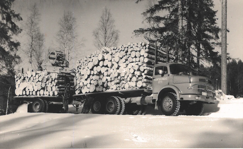 "Toinen mies nosti pölkyn kuormaa vasten pystyyn ja toinen veti sen ylös kuormaan."