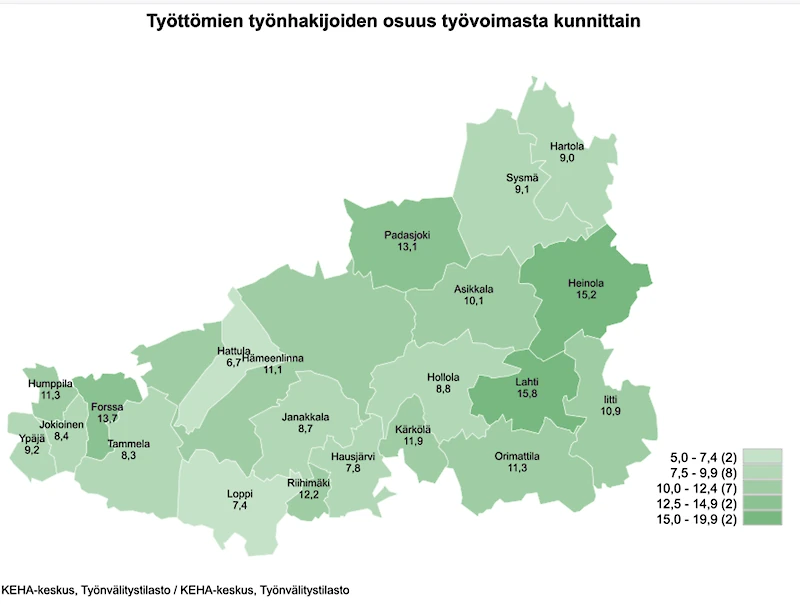 Päijät-Hämeessä työttömyys kasvoi vuodentakaisesta suhteellisesti eniten Hollolassa (22 prosenttia) ja Kärkölässä (19 prosenttia).