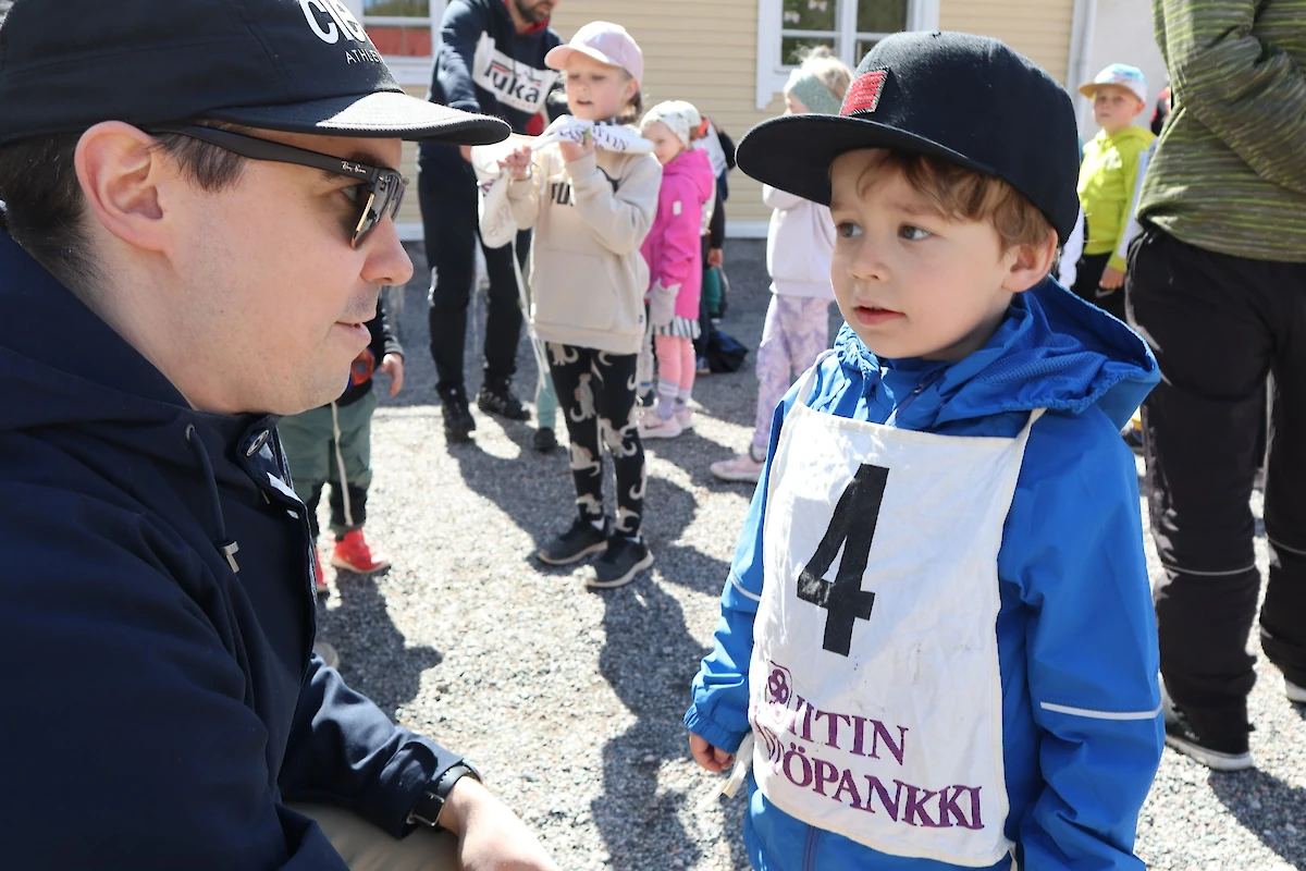 Juoksijoille puettavat numeroliivit saivat perheen pienimmät innostumaan omasta kilpailuvuorostaan. Olli-Pekka Turtiainen auttoi numeroliivin kolmivuotiaan poikansa Elielin takin päälle.